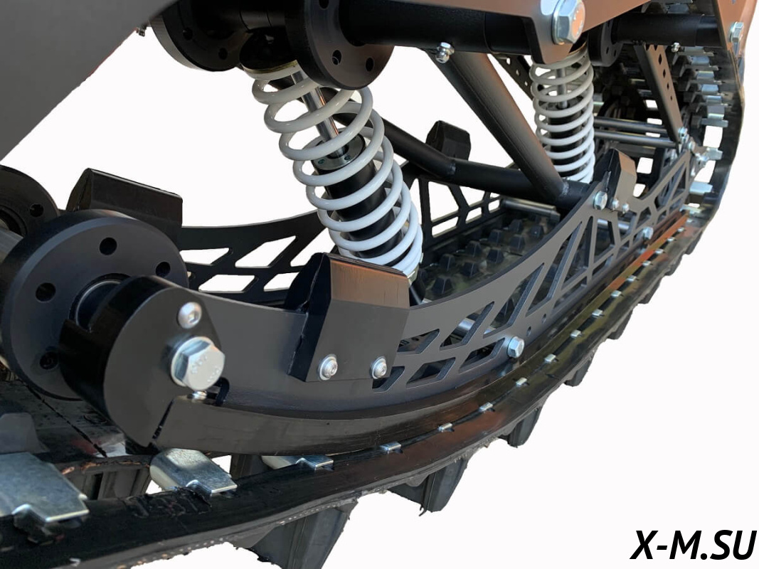 Тормоз интегрирован в лонжерон, полностью изолирован от внешней среды, отсутствует контакт со снегом. Дисковый, гидравлический, двухпоршневой суппорт. Тормозная гидравлическая магистраль 1600мм, армированный тефлон. В комплекте поставляется полностью прокачанная тормозная система с установленной тормозной машинкой.