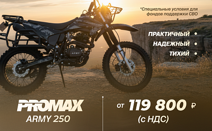 Крутой аппарат! PROMAX ARMY 250 - надежный и простой в обращении. Хромалевая рама - просто сказка, выглядит круто и надежно. Тормоза от ANJIE - супер, останавливает как вкопанный, даже на неровностях. Сидушка удобная, на ней можно и поспать, если честно. Галогенка светит нормально, главное, что не сломается. Единственное - ручной запуск, но это как бы и фишка такая, надежность превыше всего. В целом, доволен как слон, твердая 5!